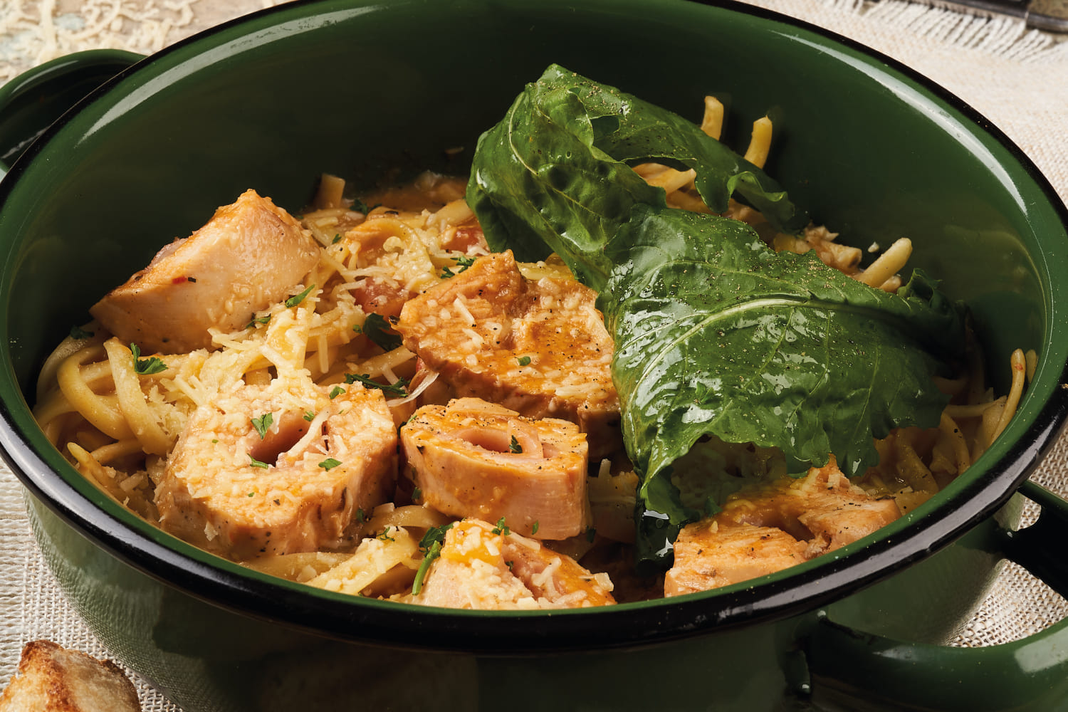 Cordon bleu chicken with rosé sauce, tomato, arugula leaves and Parmesan cheese.
