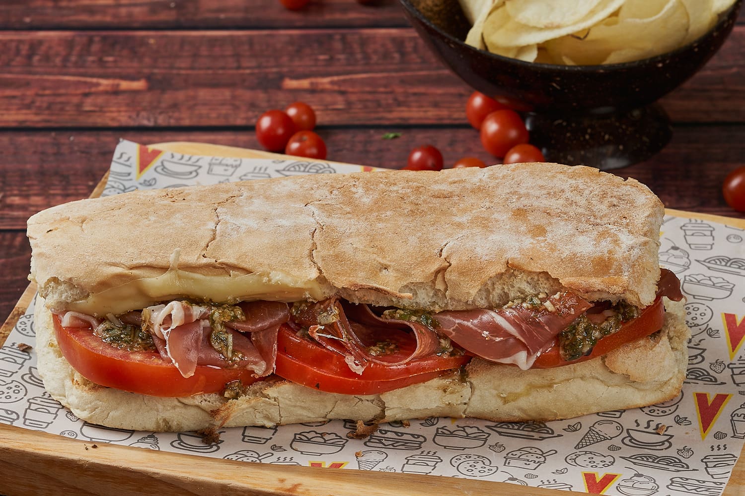Milanese bread sandwich with prosciutto, mozzarella cheese, tomato, pesto sauce and balsamic reduction.