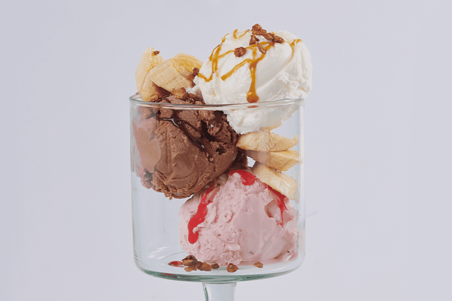 Tradicional combinación de helados de vainilla, fresa y chocolate, tajadas de banano, salsas de chocolate, fresa y caramelo y almendras caramelizadas.