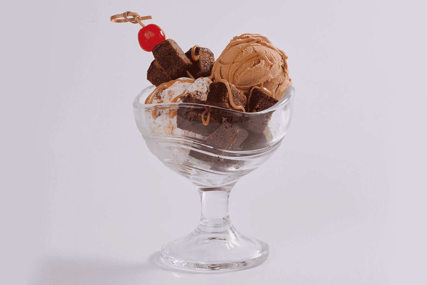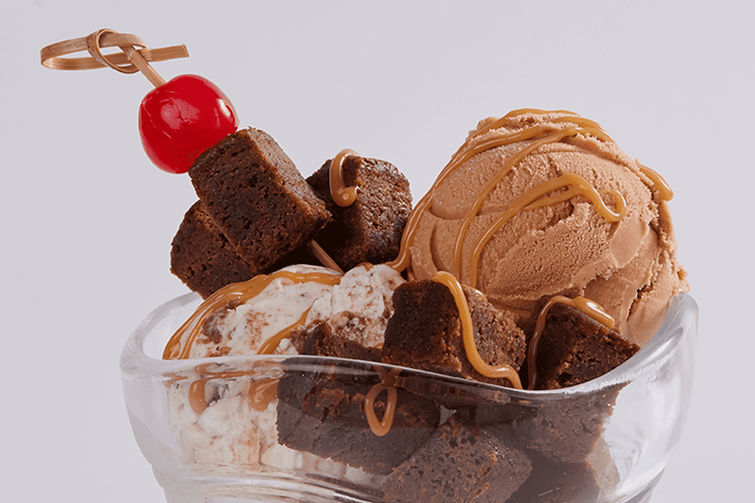 Trozos de brownie caliente con helados de arequipe y brownie con nueces, salsa de arequipe y cereza.