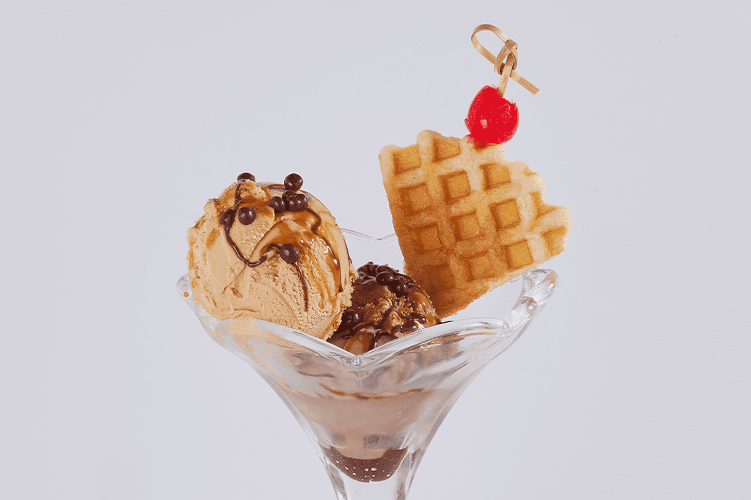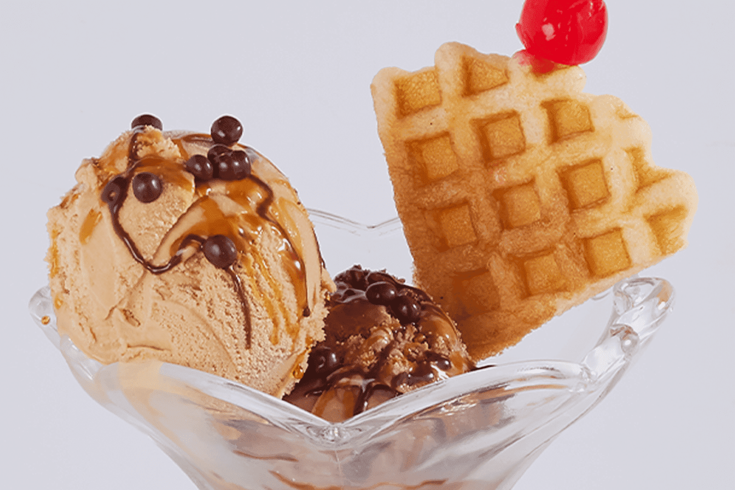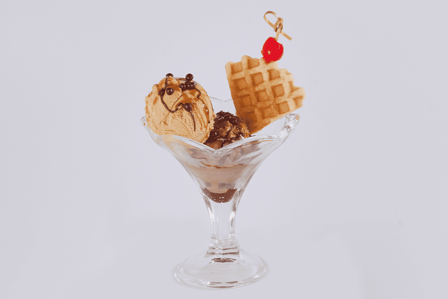 Exquisita mezcla de helados de caramelo con sal y chocolate, salsas de caramelo y chocolate, arroz tostado achocolatado, decorada con waffle y cereza.