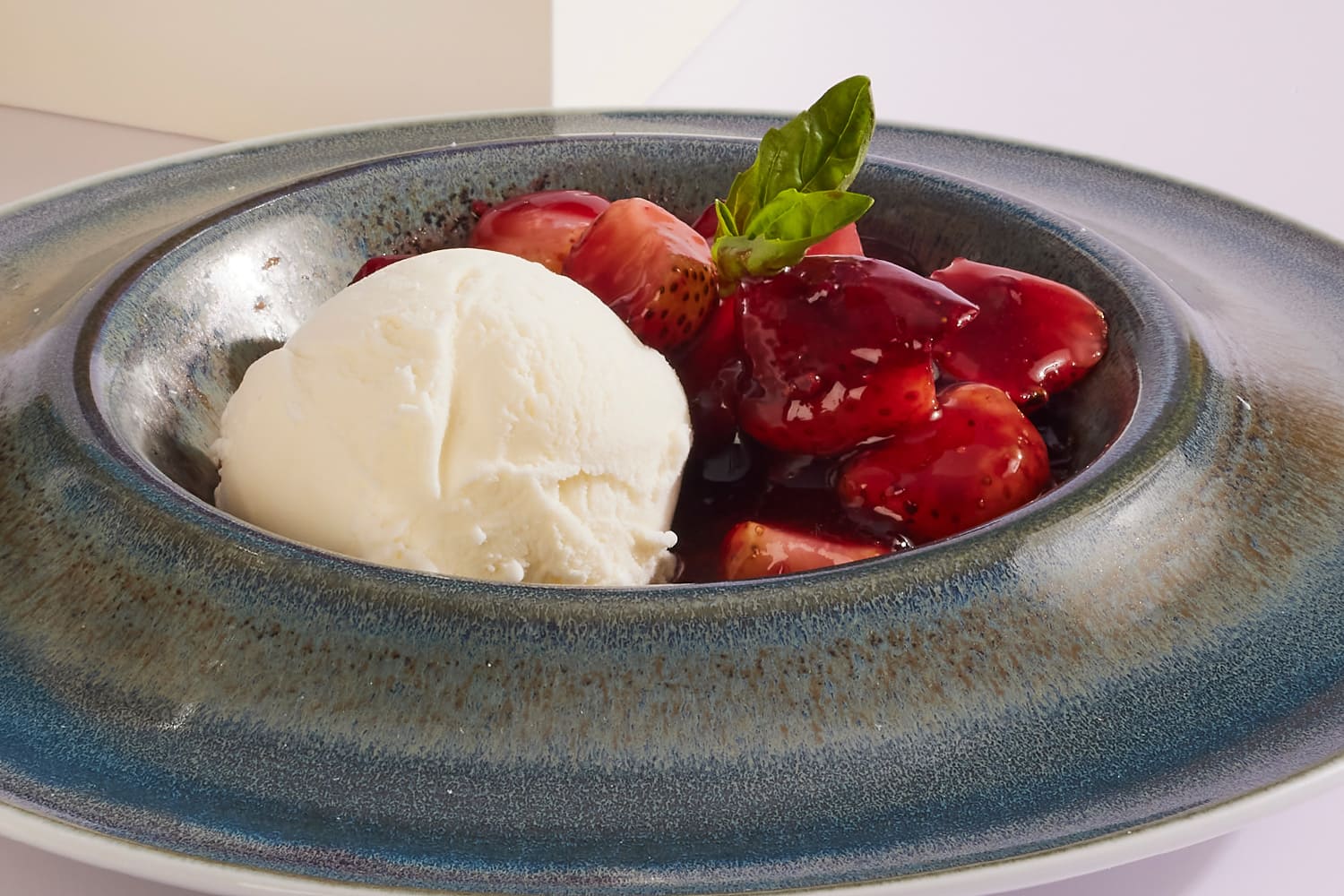 Sutil combinación de fresas con reducción de balsámico, acompañadas con helado de vainilla y brotes de albahaca.