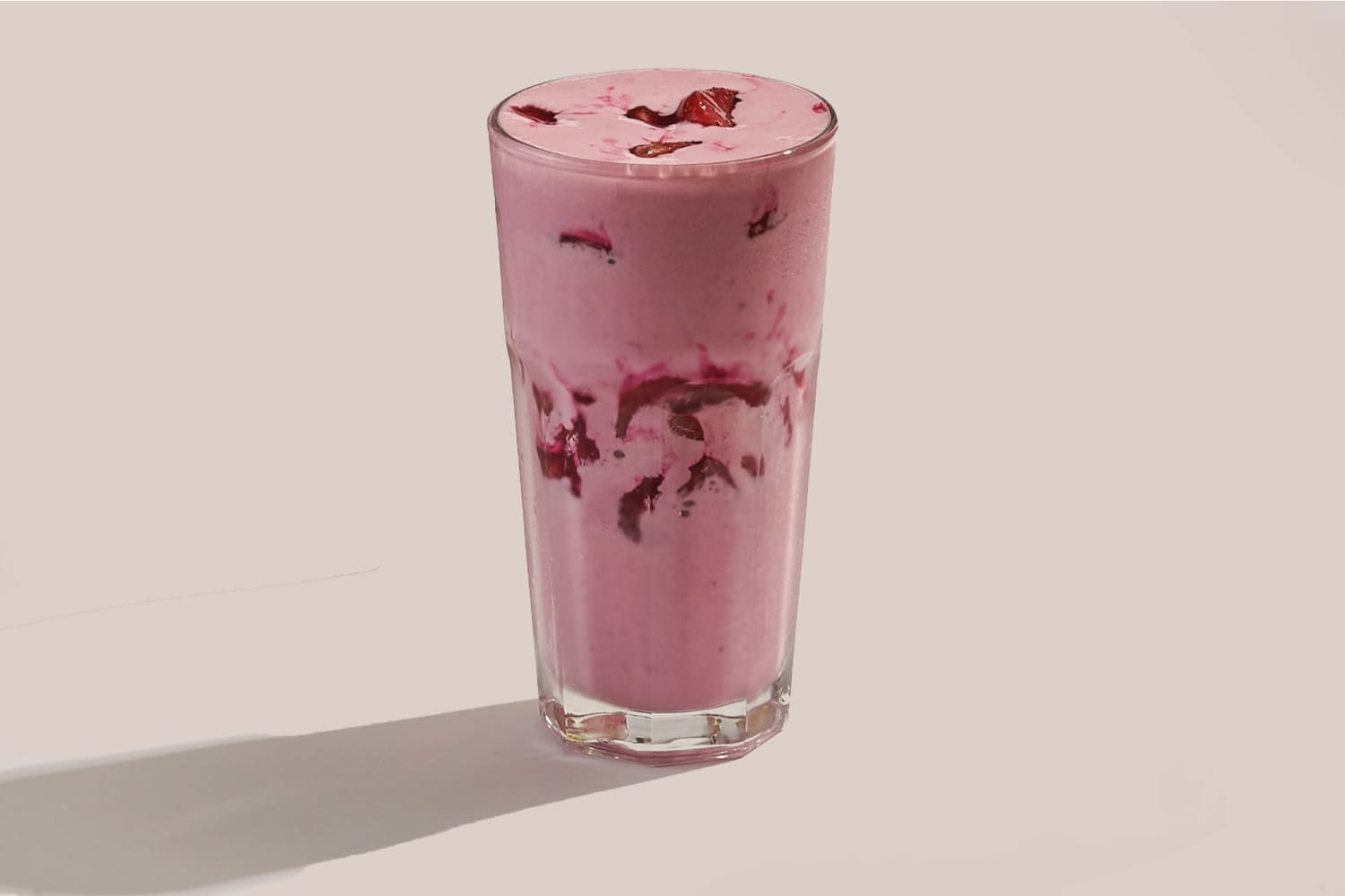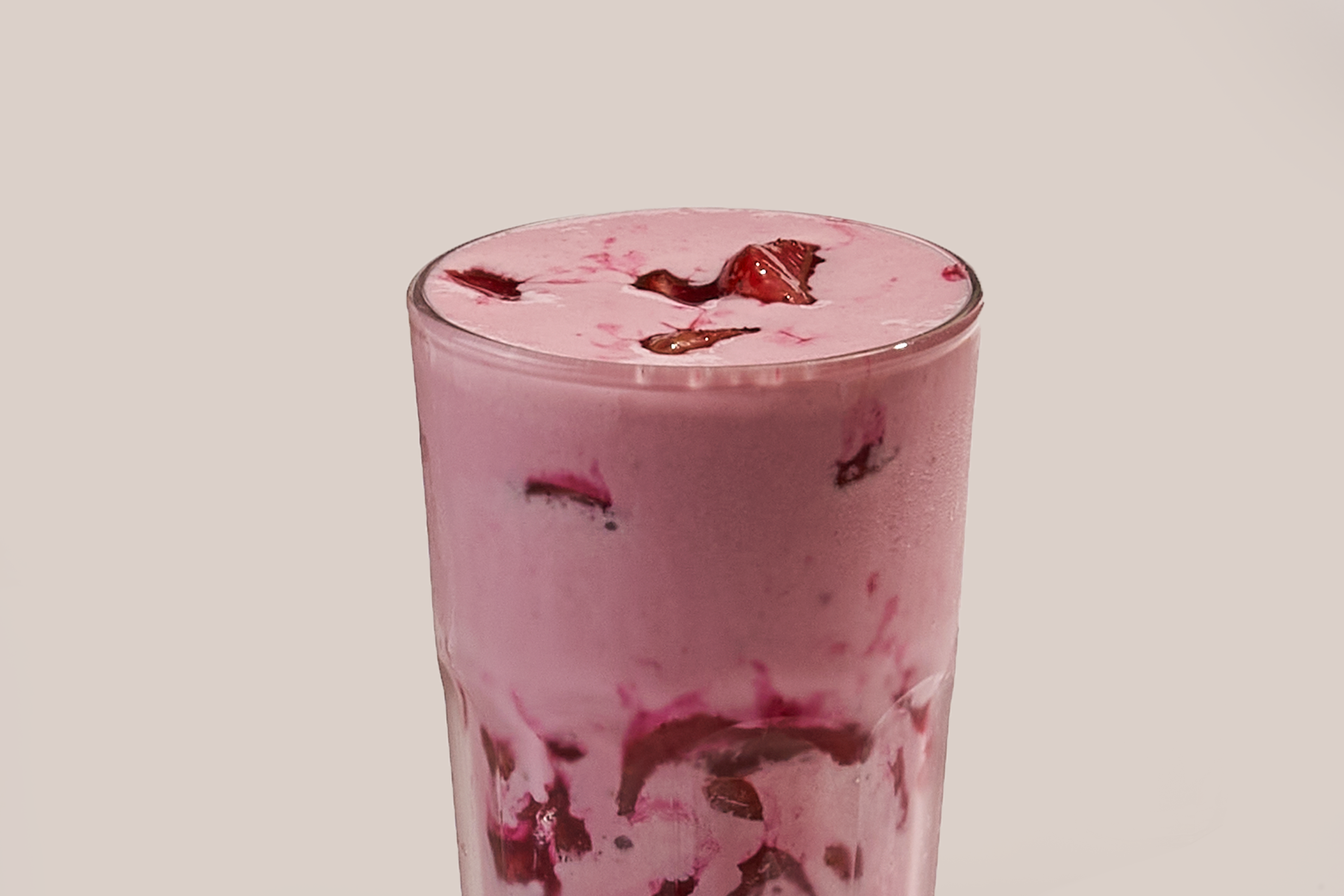 Malteada con helados de fresa y mora, trozos de fresa y salsa de mora.