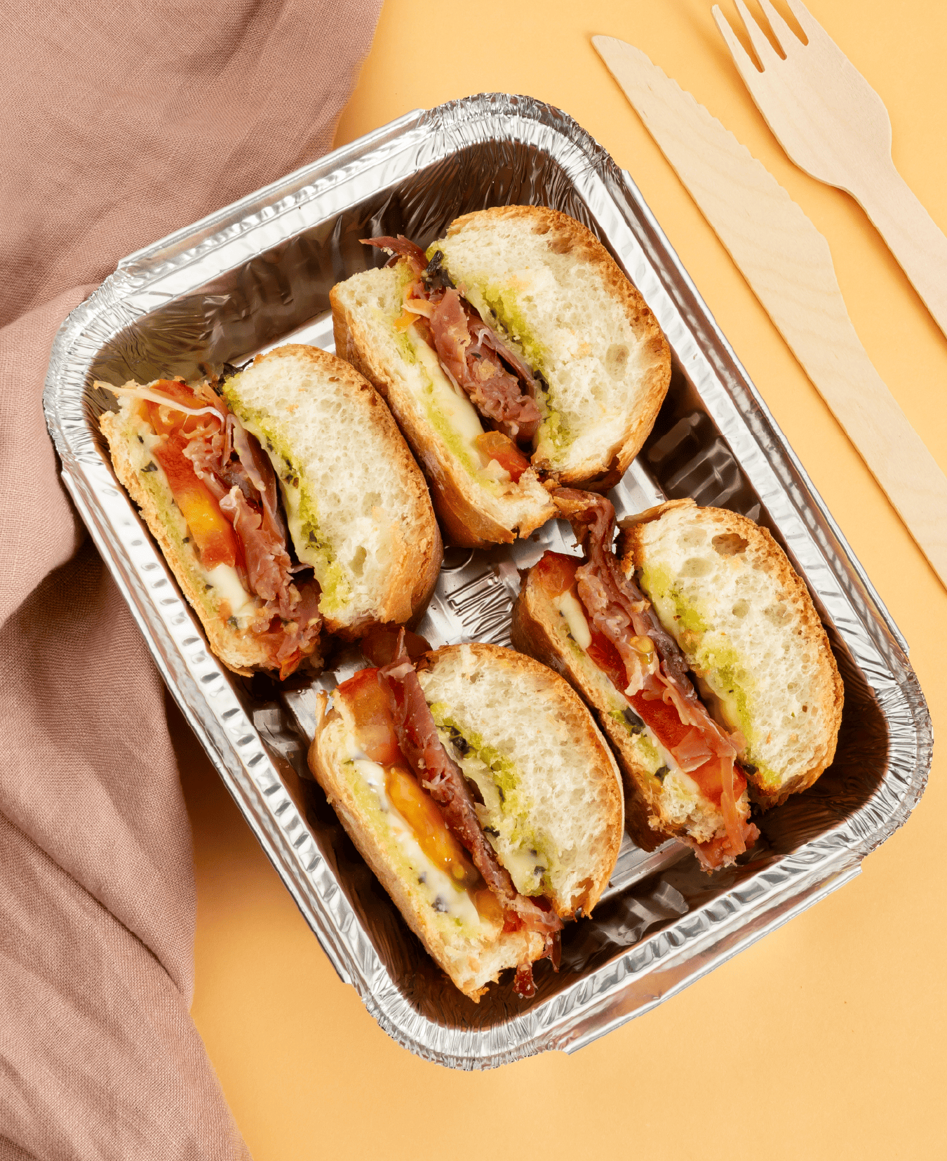 Sándwich con prosciutto, queso mozarella, tomate y salsa pesto.