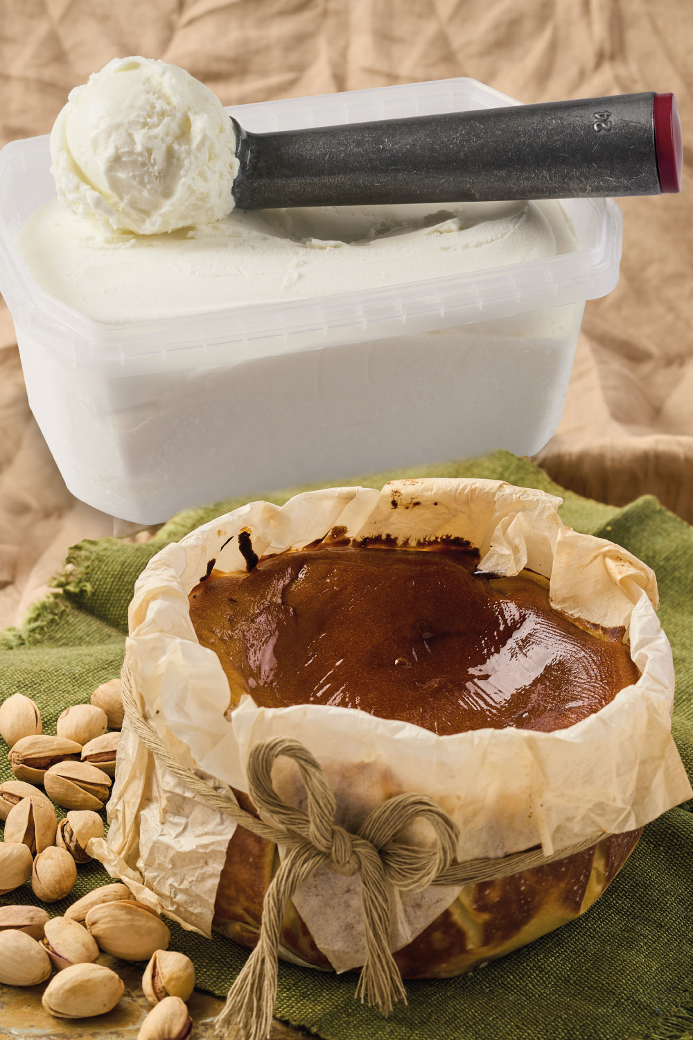 Tarta de queso vasca ligeramente caramelizada y llévalo con un litro de helado del sabor que prefieras.