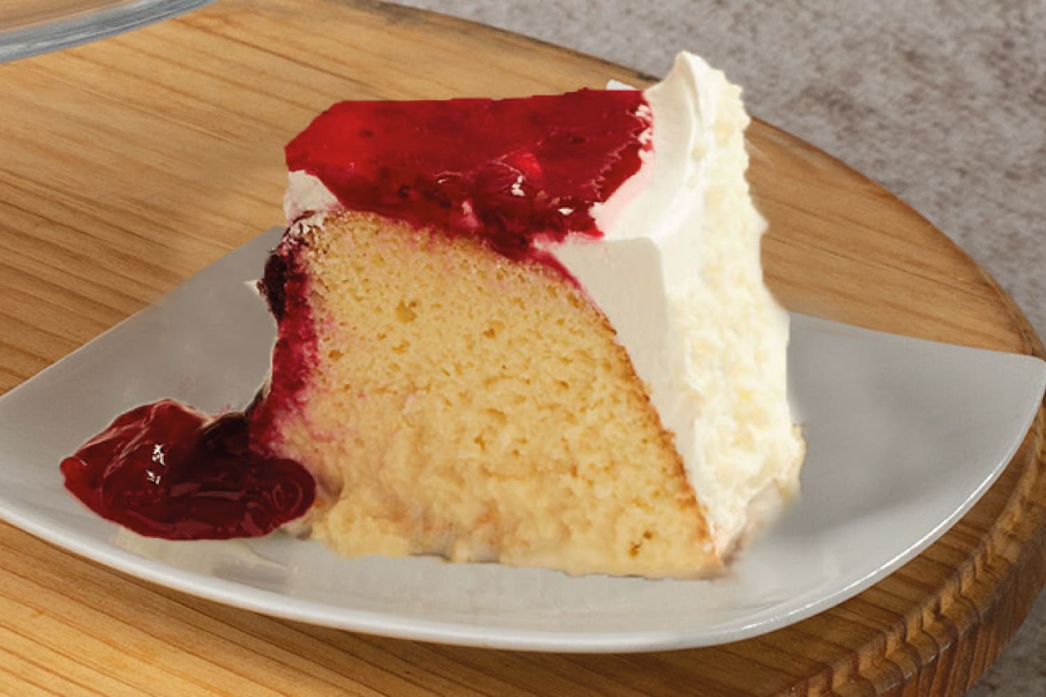 Bizcochuelo artesanal bañado en salsa tres leches con corazón de salsa de mora, cubierto con crema tipo chantilly y ralladura de chocolate blanco.